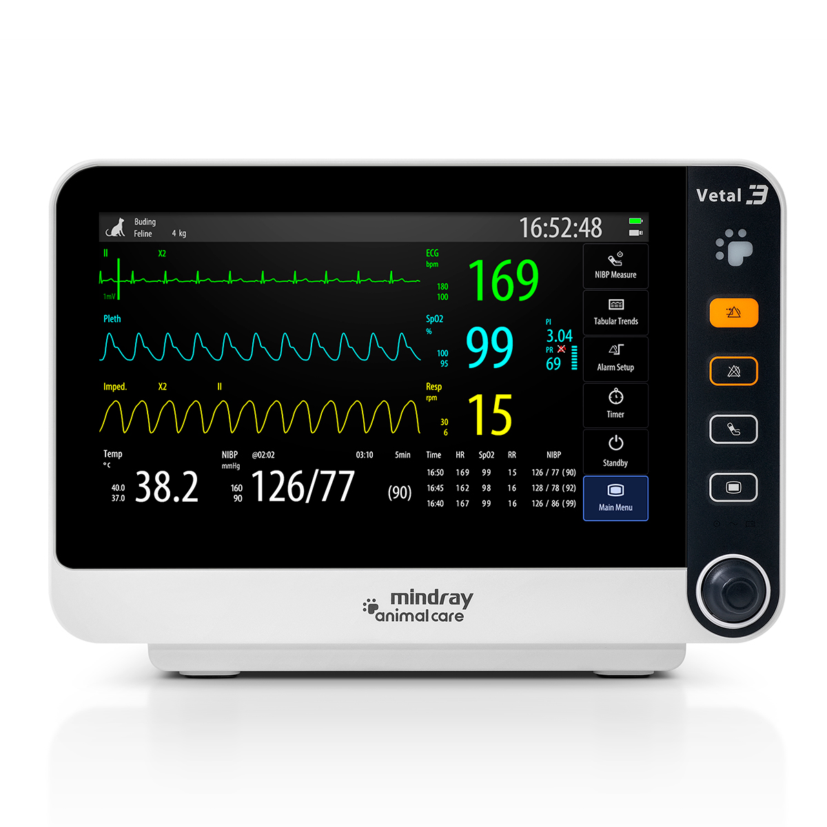 Vetal 3 es el primer monitor especializado en animales del sector para veterinarios que permite controlar las constantes vitales de los animales con múltiples parámetros. La sencilla disposición de los bloques de funciones, combinada con el exclusivo y simpático diseño de la luz de alarma en forma de garra de animal, confiere al producto para animales una imagen profesional y simpática; La guía de inicio rápido facilita la puesta en marcha. Los ajustes de la alarma se configuran automáticamente en función del tipo de animal. La interfaz de usuario clara y concisa, con letra grande y funcionamiento en dos pasos, hace que el producto sea extremadamente fácil de usar.